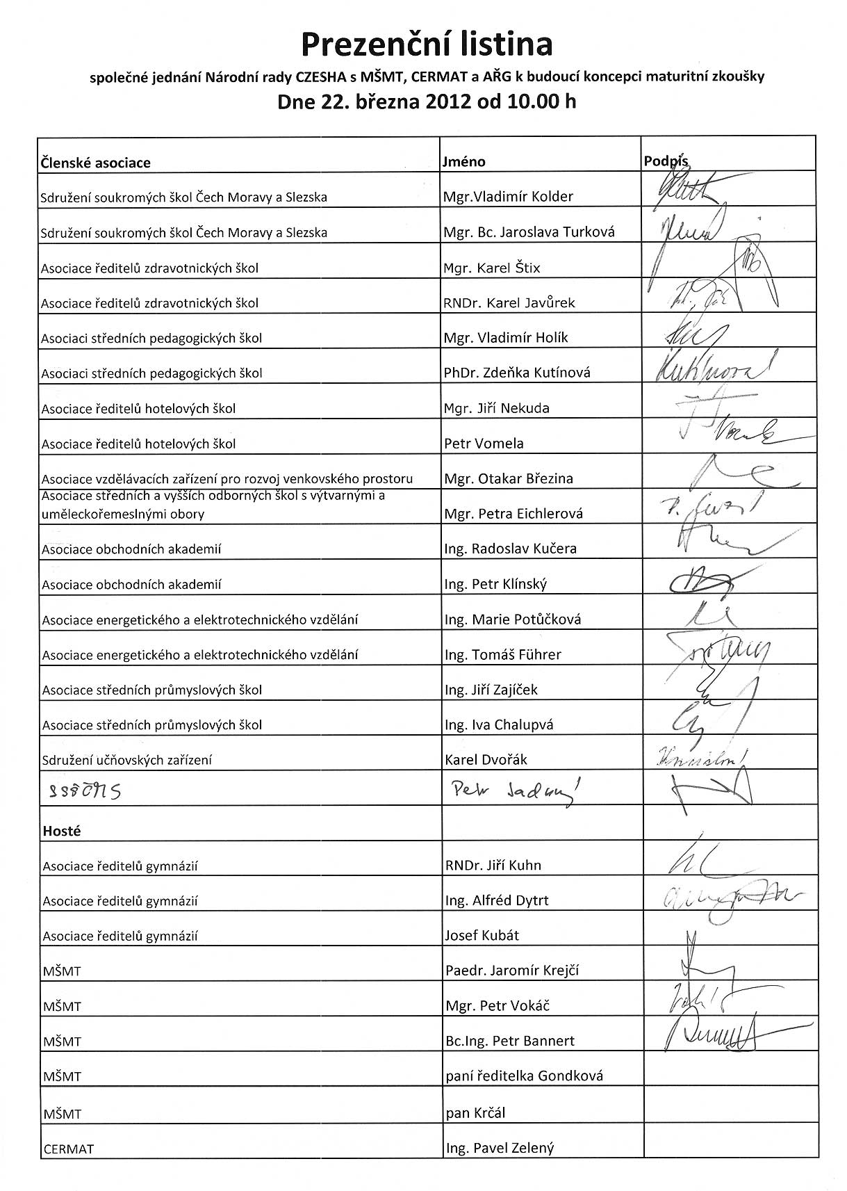 Prezenční listina - společné jednání Národní rady CZESHA s MŠMT, CERMAT a AŘG k budoucí koncepci maturitní zkoušky, dne 22.3.2012
